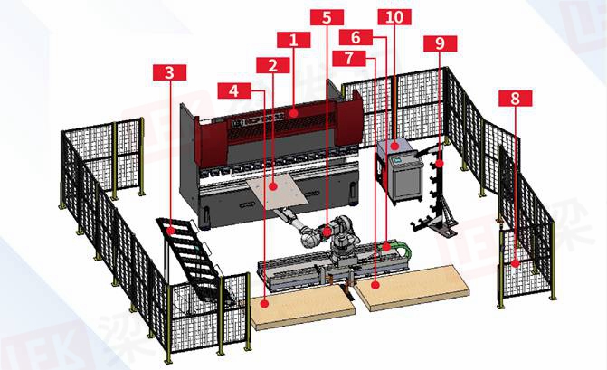 1:數(shù)控折彎?rùn)C(jī) 2:端拾器(?掌) 3:重??定位臺(tái) 4:上料臺(tái) 5:川崎機(jī)器? 6:伺服導(dǎo)軌系統(tǒng) 7:下料臺(tái) 8:安全圍欄 9:翻料裝置 10:系統(tǒng)控制柜